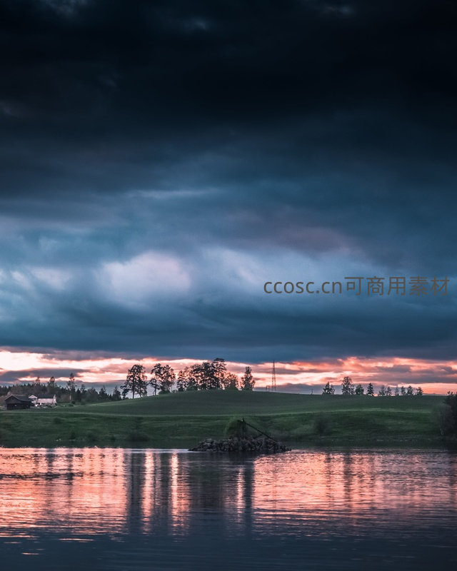 暴风雨前的湖岸奇景:暗云翻涌与晚霞熔金交映水天一色