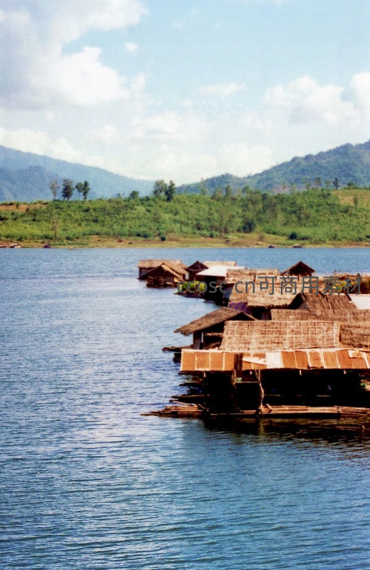 泰国或老挝边境的典型水上社区,以竹木搭建的茅草顶房屋连片浮于宽阔河流之上,背景是郁郁葱葱的丘陵与晴朗天空,展现人与自然和谐共生的传统生活方式。