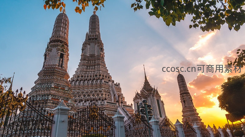 黄昏时分航拍曼谷郑王庙(黎明寺),四座高耸佛塔镶嵌彩色瓷片,在金色余晖中熠熠生辉;前景绿叶框景,云层透出光束,展现东南亚宗教建筑与自然光影的和谐之美。