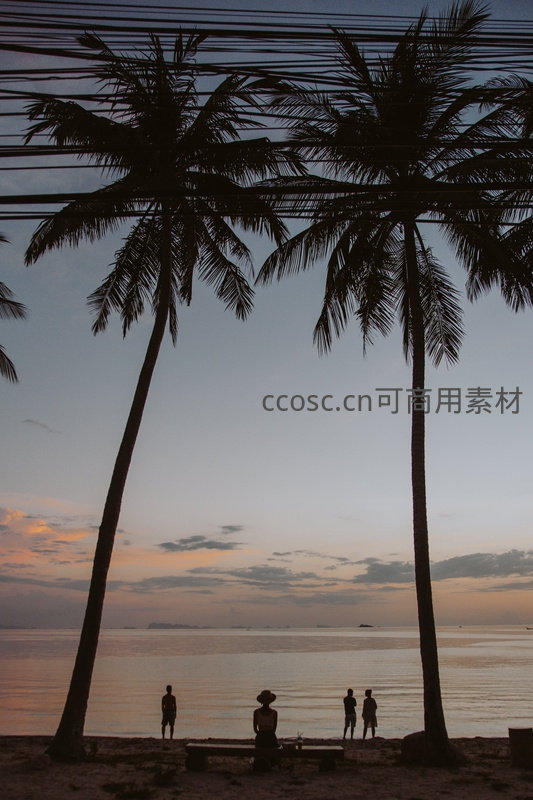 两棵高耸椰树与横亘电线构成几何框架,四人轮廓伫立沙滩,远眺渐变橙紫天际与平静海面,捕捉海岛傍晚的诗意与人间烟火气。