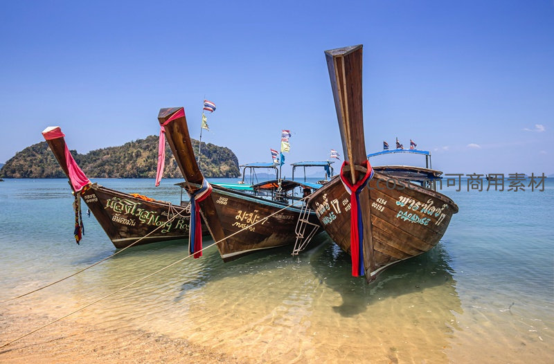 晴空下,三艘木质长尾船船头高翘、彩带飘扬,船身刻有泰文与编号,停泊于透明浅海中,远处小岛轮廓清晰,水面倒影粼粼,展现泰国南部独特的渔业与旅游文化融合景象。