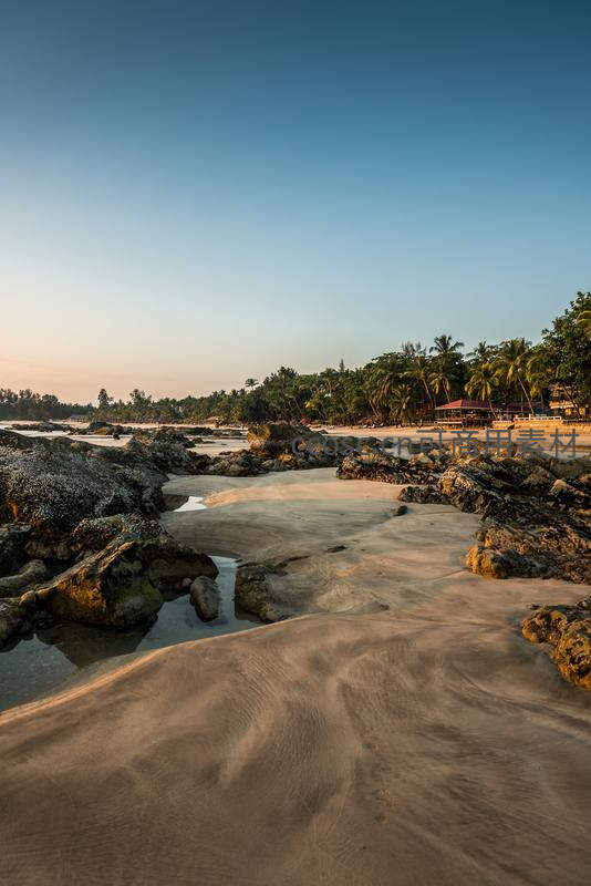 黄昏椰林海岸线,礁石与细沙交织的静谧海滩风光