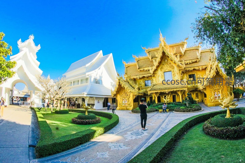 泰国清莱著名景点白庙(Wat Rong Khun)与金庙(Wat Rong Suea Ten)同框呈现,纯白雕塑拱门与鎏金繁复殿宇形成强烈对比,修剪整齐的绿篱与石径环绕其间,游人驻足拍照,体现现代艺术与传统信仰交融的独特魅力。