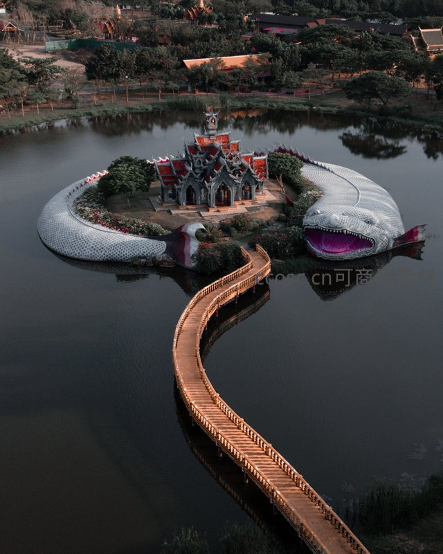航拍视角下,一座泰式传统风格宫殿坐落于湖心,被巨型银鳞蛇雕塑环抱,蛇首张口露紫舌,木质栈桥蜿蜒连接岸边,融合信仰、艺术与自然奇观。