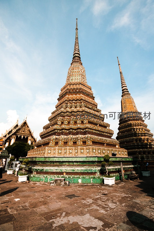 低角度聚焦玉佛寺中心佛塔,层层叠叠的阶梯式结构覆以青绿琉璃与金饰,尖顶直指苍穹;阳光勾勒出浮雕纹样,地面斑驳石砖诉说着百年历史沉淀。