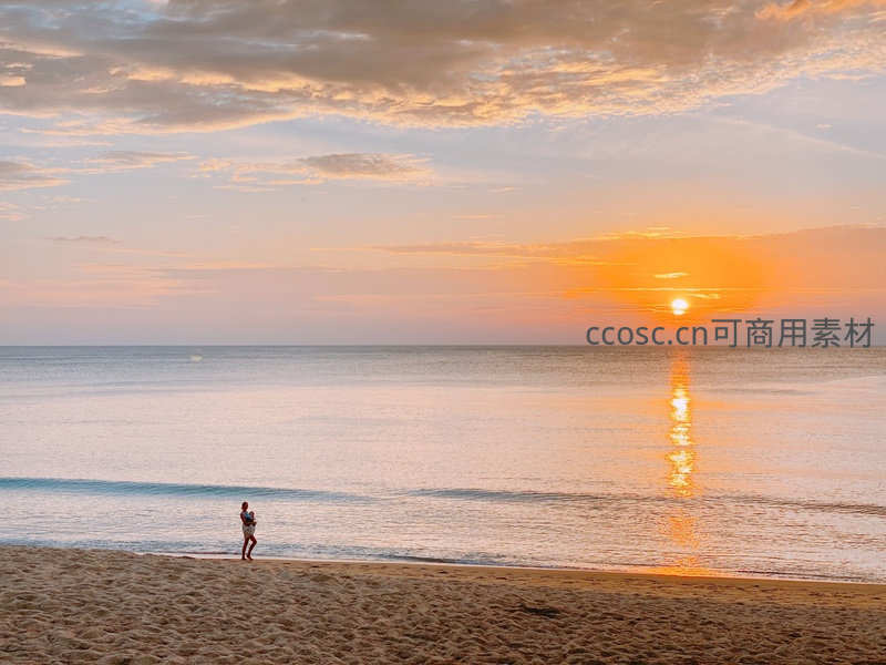 孤影漫步于金色日落海滩,海面波光粼粼倒映绚烂晚霞