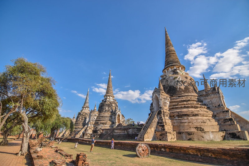 泰国大城府历史公园内,多座锥形佛塔与残垣断壁在澄澈蓝天映衬下庄严恢弘;斑驳砂岩塔身刻满岁月痕迹,绿树掩映中游客缓步穿行,感受昔日暹罗王国辉煌文明的余韵与宁静肃穆氛围。