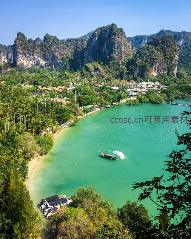 高空俯瞰东南亚热带海湾,翡翠色海水环抱陡峭石灰岩山峰,岸边棕榈成林、村落错落,一艘长尾船划出白色水痕,呈现典型喀斯特海岸的壮丽与宁静。