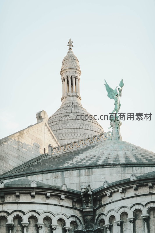 巴黎圣心大教堂穹顶与天使雕像特写,青绿色铜像展翅立于灰白石材之上