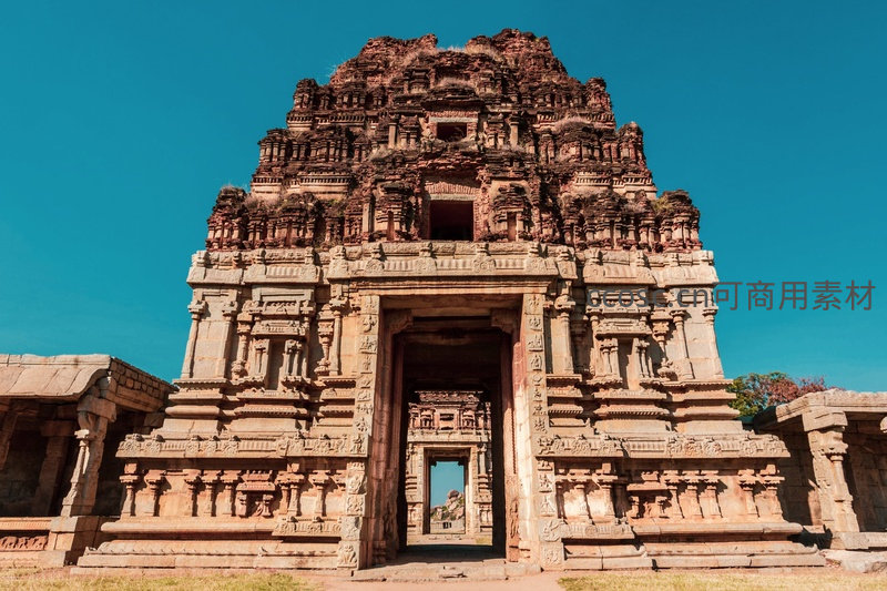 一座南印度风格的古老神庙入口,红砂岩材质雕刻着密集的神祇、神话场景与装饰纹样,双层塔式门楼巍峨耸立,背景湛蓝晴空衬托其庄严神圣,体现德干高原地区12世纪建筑巅峰技艺。