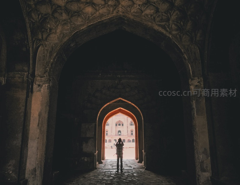 阿格拉堡拱门剪影摄影,游客伫立门洞远眺红堡,光影对比强烈