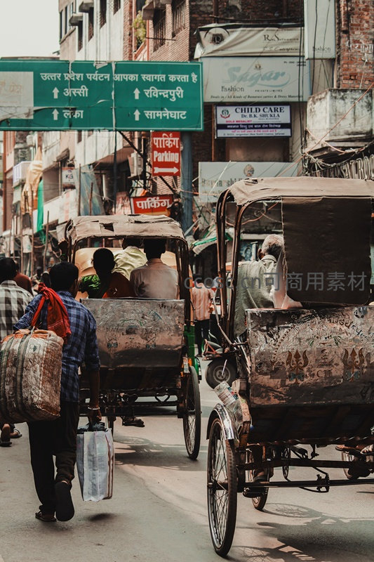 拥挤的印度城市小巷中,多辆装饰斑驳的人力车穿梭而过,行人肩扛货物穿行,绿底印地语路牌与店铺招牌林立,真实呈现日常交通与市井活力。