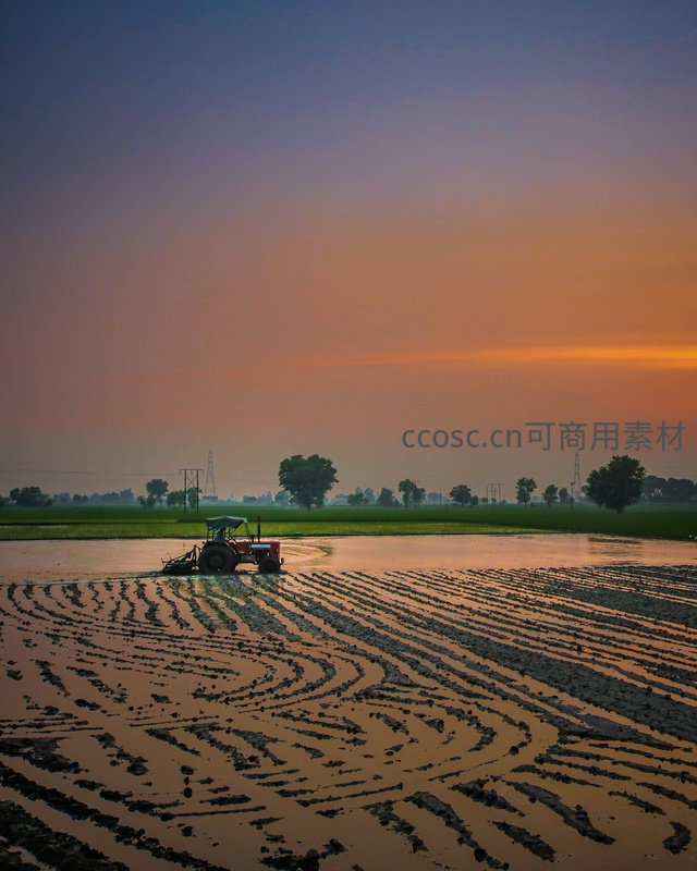 黎明时分拖拉机耕作水田,波纹状泥痕与渐变天际线构成田园诗画