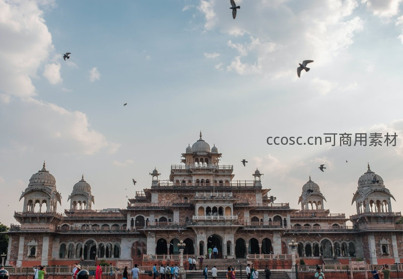 斋浦尔城市宫殿前鸽群飞舞,古典建筑与蓝天白云相映成趣
