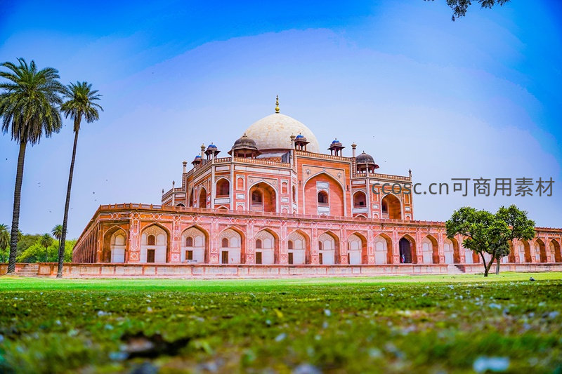印度德里胡马云陵墓宏伟全景,红砂岩结构配白色大理石穹顶,两侧高耸棕榈树,前景翠绿草坪低角度仰拍,展现莫卧儿帝国建筑艺术与自然和谐之美。