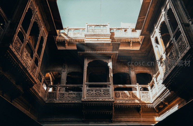俯视视角拍摄印度拉贾斯坦邦传统haveli庭院,多层木质阳台布满精细Jali镂空雕花,阳光从天井洒落形成明暗交错的光影图案,体现南亚古典建筑工艺与空间美学。