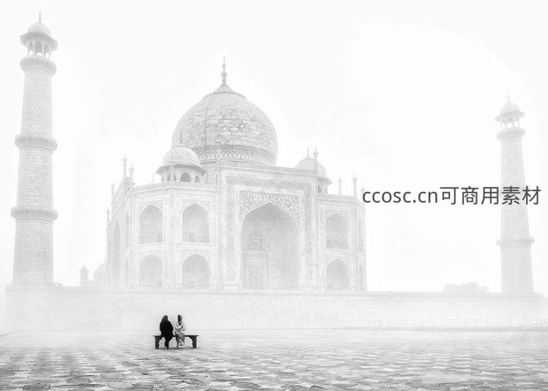 浓雾笼罩下的泰姬陵若隐若现,仅轮廓可见,前景石板广场上一对男女并肩坐于长椅,背影渺小却温情;黑白影像强化静谧与哲思,展现自然与人文的诗意对话。