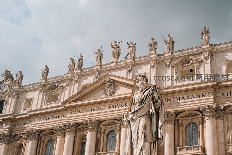 圣彼得大教堂正立面顶部排列着十二使徒与圣人雕像,米黄色大理石在柔和光线下呈现细腻纹理与岁月痕迹,拉丁铭文清晰可见,体现17世纪巴洛克建筑的宏伟与虔诚精神。