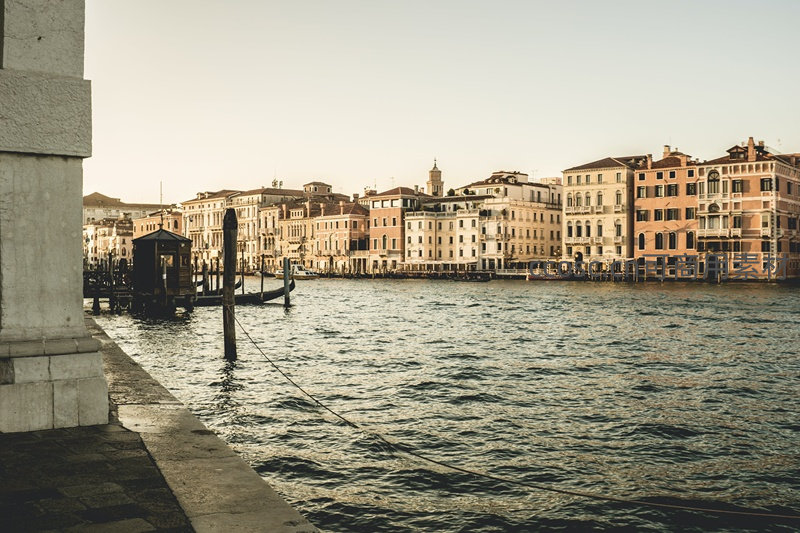 威尼斯大运河畔黄昏景致,老建筑群沿岸排列,小艇系泊石墩静候潮汐