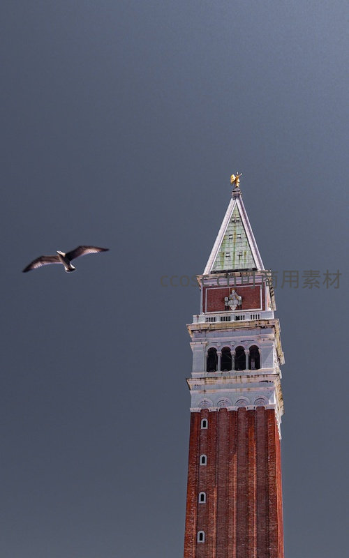 乌云密布的天空下,威尼斯圣马可钟楼高耸入云,红砖塔身与绿色尖顶形成鲜明对比;一只海鸥展翅掠过左侧,为庄严古迹增添动感与生命力,彰显水城独特气质。