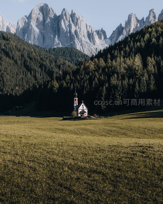 一座精致的白色乡村教堂孤悬于开阔草场中央,四周被深绿针叶林覆盖的山坡环绕,远处锯齿状白云岩峰群巍然矗立,光影交错间呈现神圣与自然和谐共存的诗意画面。