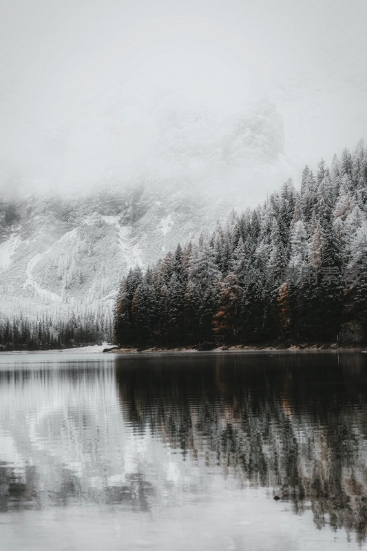 雾霭雪山湖畔:雪覆松林倒影于平静冰湖的冬日画卷