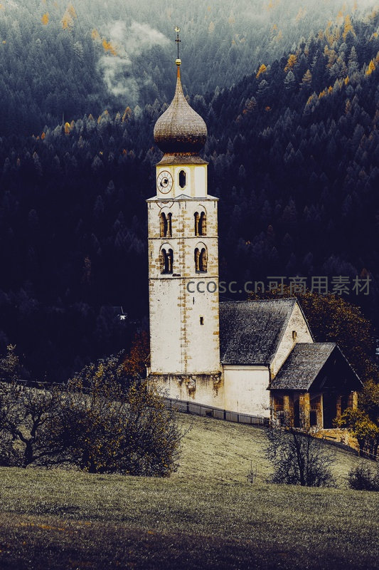 山间钟楼教堂:洋葱顶塔楼矗立于秋林覆盖山坡之上