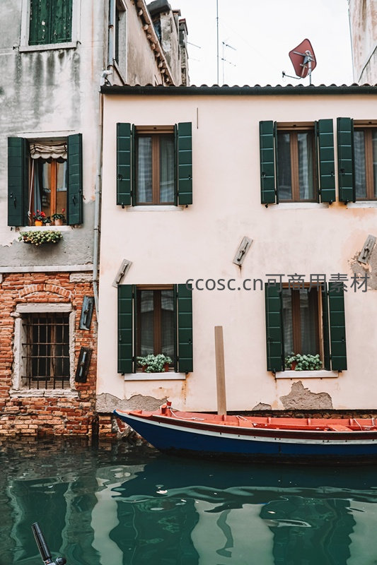 威尼斯水巷人家窗台花盆与停泊小船,静谧水城生活剪影