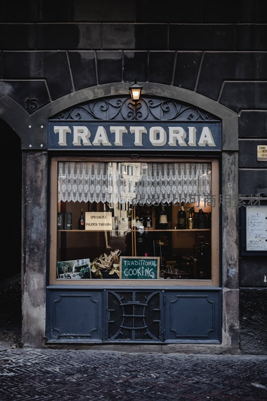深色石墙拱形门洞内,一家传统意大利小餐馆橱窗陈列着葡萄酒、橄榄油与手写菜单,‘TRATTORIA’字样醒目,蕾丝帘后隐约可见室内陈设,营造出浓郁怀旧与地道美食氛围。