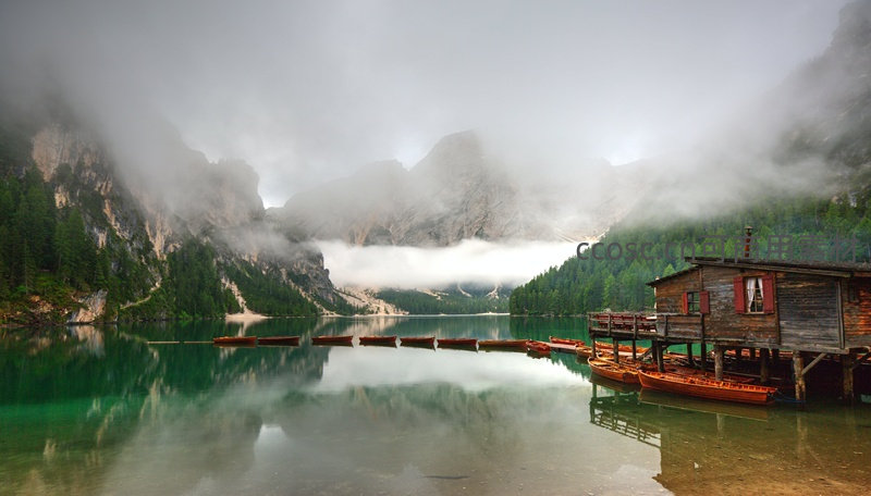 雾霭缭绕的湖畔木屋与停泊小舟,童话般阿尔卑斯隐秘村落