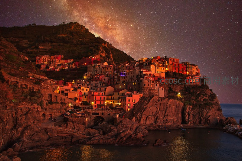 五渔村夜景星空下的马纳罗拉彩屋与银河