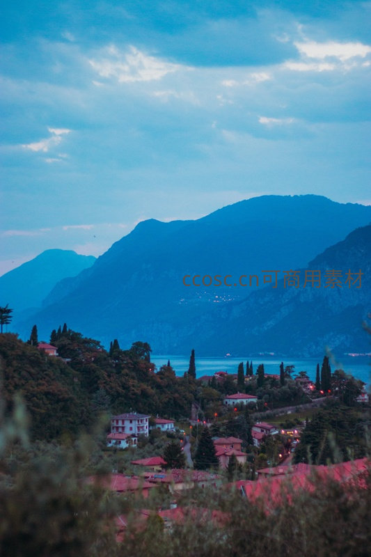 黄昏科莫湖畔山居村落,远山如黛灯火初上