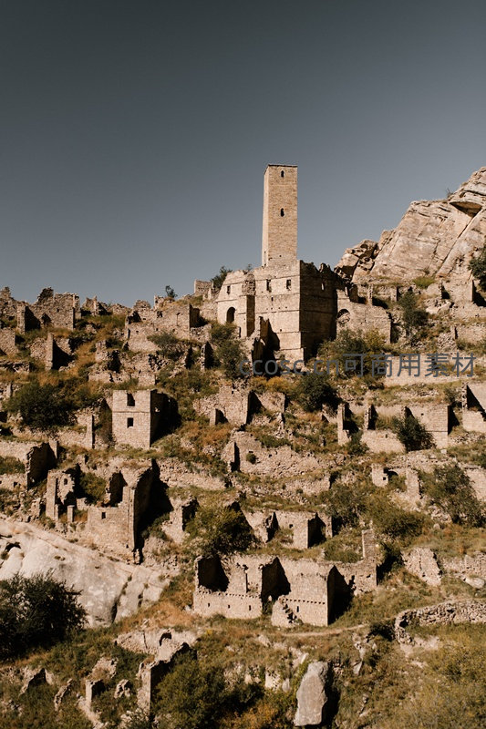 阳光下拍摄高加索山区古老防御村落遗址,中央高耸石砌瞭望塔巍然挺立,周围残垣断壁依山而建,野草丛生,石墙斑驳,见证千年沧桑,呈现独特民族建筑智慧与历史厚重感。