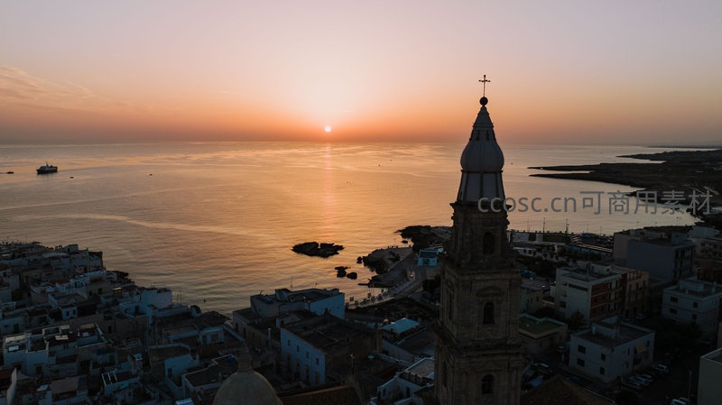 黄昏航拍捕捉一座地中海白色小镇临海一隅,古老钟楼高耸为画面焦点,十字架在霞光中轮廓分明;平静海面反射橙金余晖,远处小岛与渔船静泊,营造出诗意安宁的南欧海岸暮色氛围。