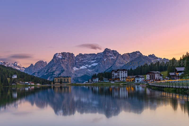 意大利多洛米蒂山区的湖畔小镇在黄昏时分静谧如画,巍峨雪峰倒映于平静湖面,暖光洒在传统建筑上,桥边车流留下光轨,展现高山湖泊与人文和谐共生的壮丽景致。