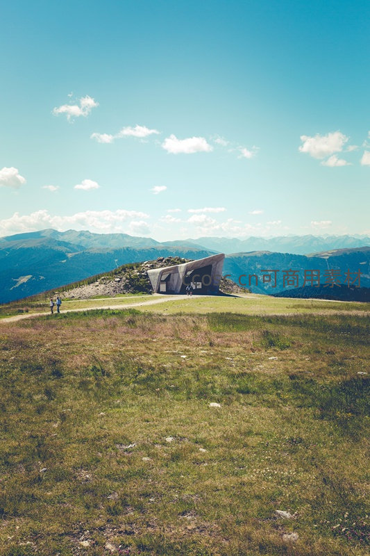 晴朗日光下,一座混凝土折面观景台静卧于高山草甸之巅,线条利落简约;远处层叠雪峰连绵起伏,近处两人驻足远眺;画面构图开阔,绿草、灰岩、蓝空三色交融,传递宁静与壮阔并存的自然哲思。
