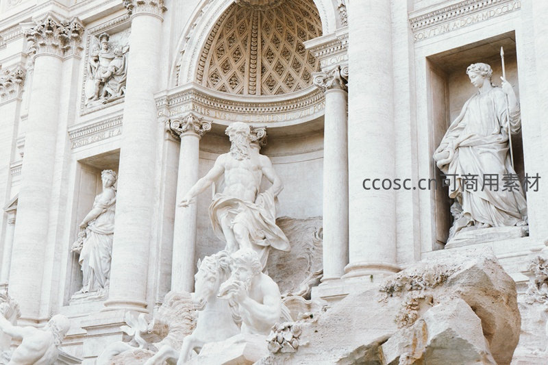 罗马许愿池特写:巴洛克雕塑群细节,海神与骏马栩栩如生