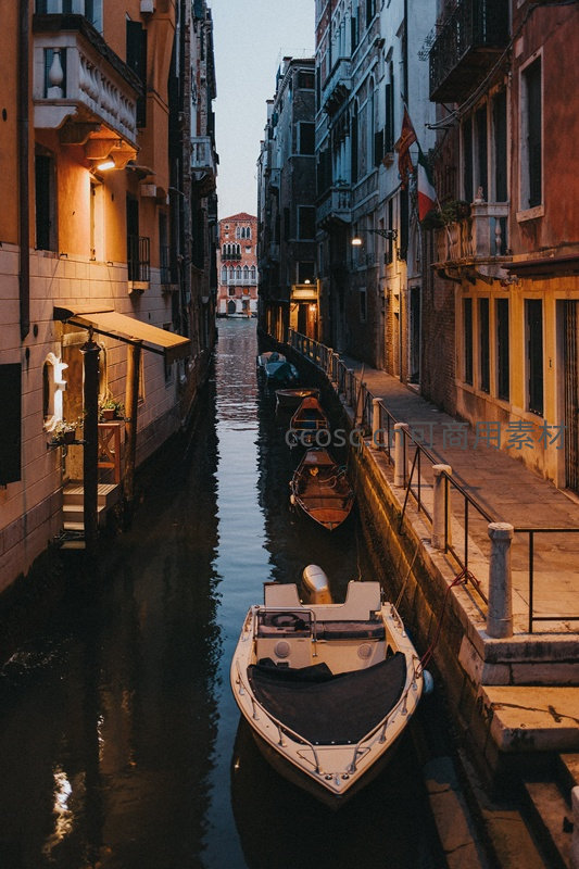 威尼斯黄昏水巷,古建筑倒影与停泊小船静谧相映