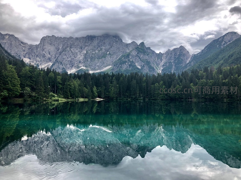 清澈见底的高山湖泊宛如天然镜面,完整倒映陡峭灰岩山峰与浓密针叶林带;乌云低垂掠过峰顶,水面泛起细微涟漪打破对称构图,冷色调中透出清冽生机,展现欧洲阿尔卑斯地区原始壮丽的自然生态画卷。
