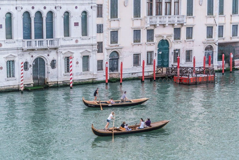 意大利威尼斯大运河畔,两艘传统贡多拉载着游客缓缓划过碧绿水面,背景是巴洛克风格的古老宫殿与红白条纹系船柱,展现水城独特风情与历史韵味。