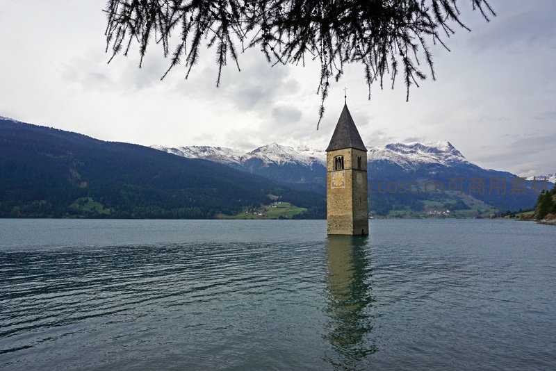意大利雷西亚湖中矗立着被淹没村庄的钟楼,尖顶石塔半浸于碧波,背景是连绵雪峰与苍翠山峦,前景松枝低垂构图精巧,展现人与自然交融的壮美与沧桑。