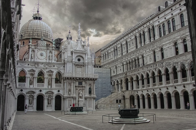 威尼斯圣马可广场一隅,以圣马可钟楼与总督宫为背景,精美的哥特式与文艺复兴风格石构建筑在厚重阴云下更显庄重肃穆;拱廊、浮雕、穹顶细节清晰,少量游客点缀其间,凸显历史空间的静谧与时间沉淀感。