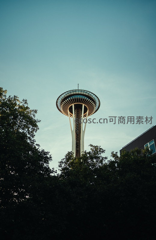 西雅图太空针塔穿林而立,青空下现代结构与绿意共生