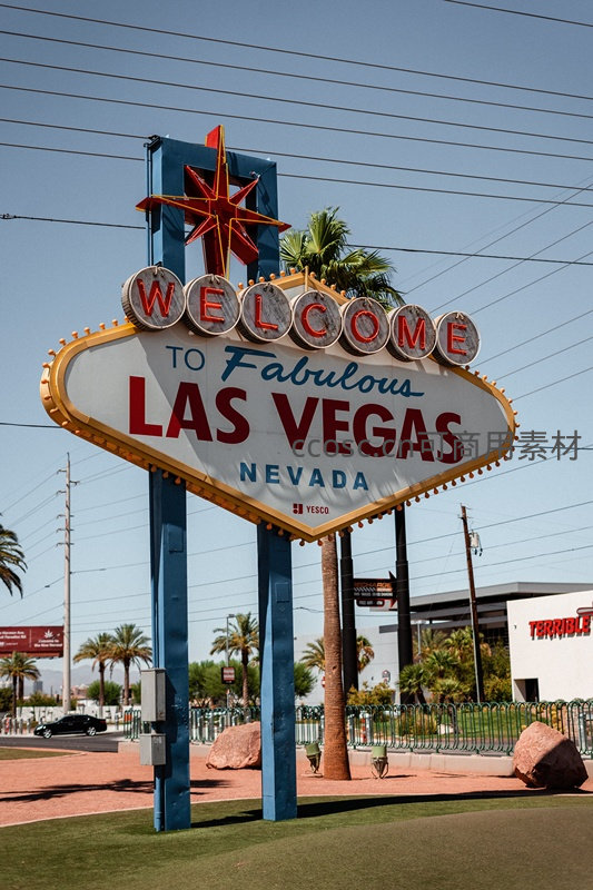 iconic 'Welcome to Fabulous Las Vegas Nevada'标志矗立于道路旁,红蓝配色醒目,顶部星形装饰闪耀;背景可见棕榈树、电线与现代建筑,展现赌城入口的独特魅力与活力氛围。