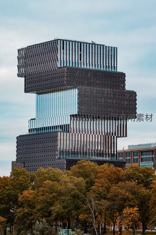 一座极具未来感的错层式高层建筑,外立面采用深色金属格栅与通透玻璃交替组合,层层叠退形成独特立体结构;前景是金黄与橙红交织的秋日树林,天空云层淡雅,整体呈现建筑与自然和谐共生的当代都市美学。