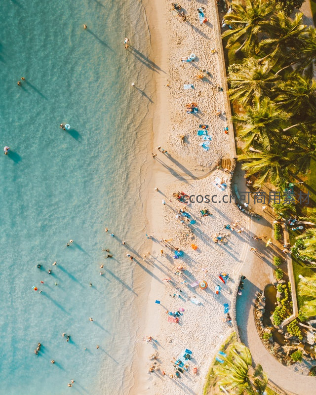 从斜上方捕捉海滩动态场景:透明浅海中多人游泳浮潜,沙滩上五彩遮阳伞与毛巾点缀其间,蜿蜒小径穿行于茂密椰林,光影斑驳洒落,展现热带海滨活力四射又悠闲自在的假日生活图景。