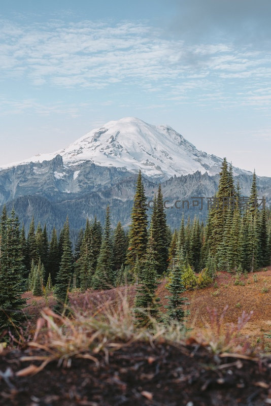 从林间高地仰望雷尼尔山,雪冠在薄云下熠熠生辉;中景是茂密挺拔的冷杉与铁杉林,地面点缀橙红秋草;前景虚化枯草与湿润土壤,营造深度感与季节氛围,体现人与自然和谐共处的野趣。