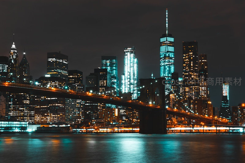 布鲁克林大桥夜景,曼哈顿天际线灯火璀璨倒映水中