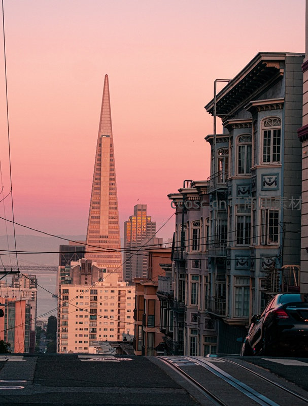 旧金山黄昏街景:泛美金字塔与维多利亚式建筑交相辉映