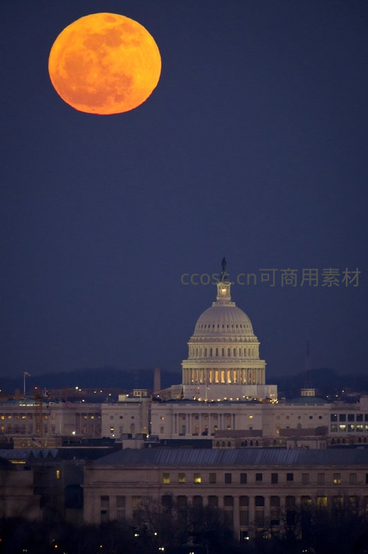 橙红满月高悬国会大厦夜空,庄严建筑与天体奇观交相辉映